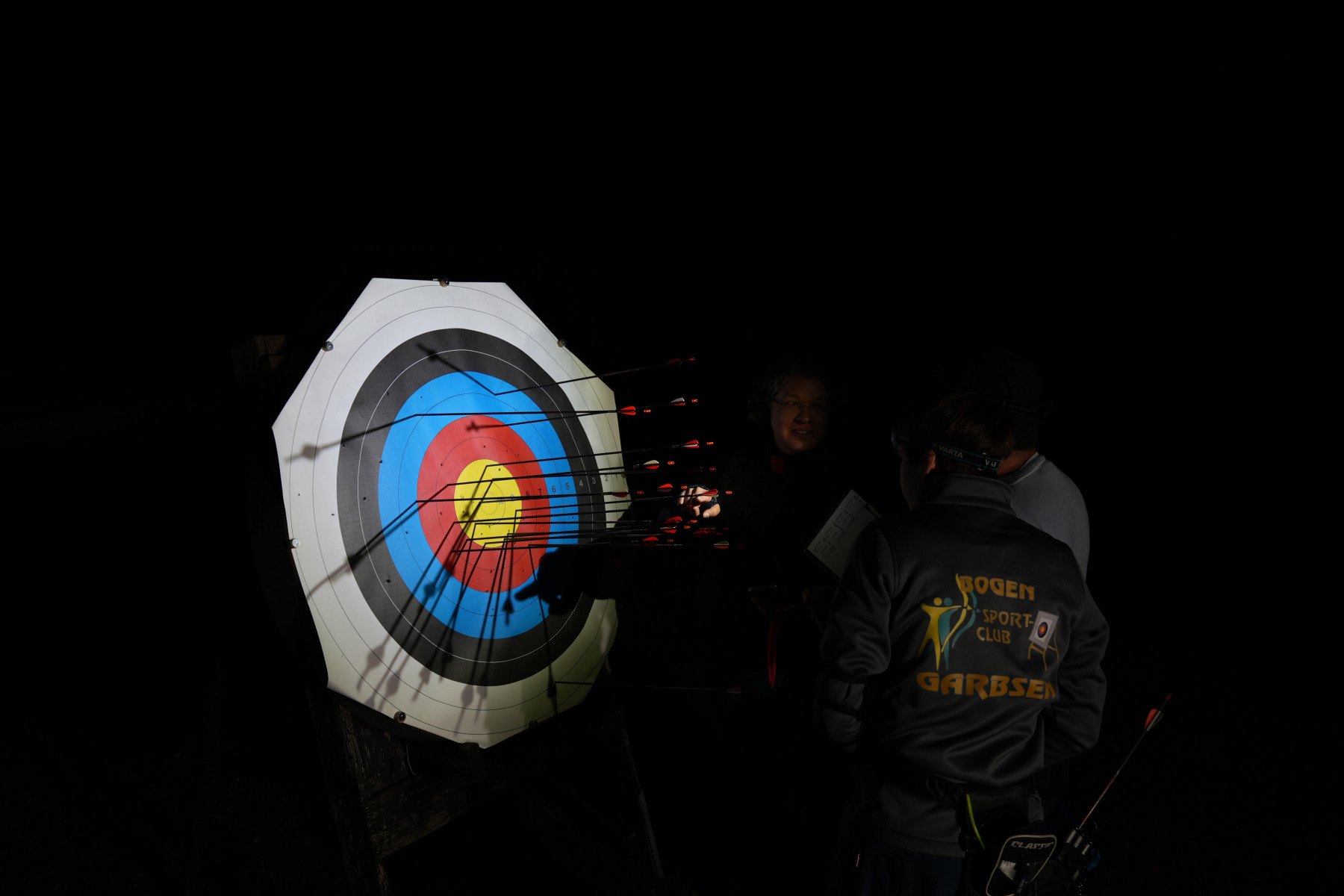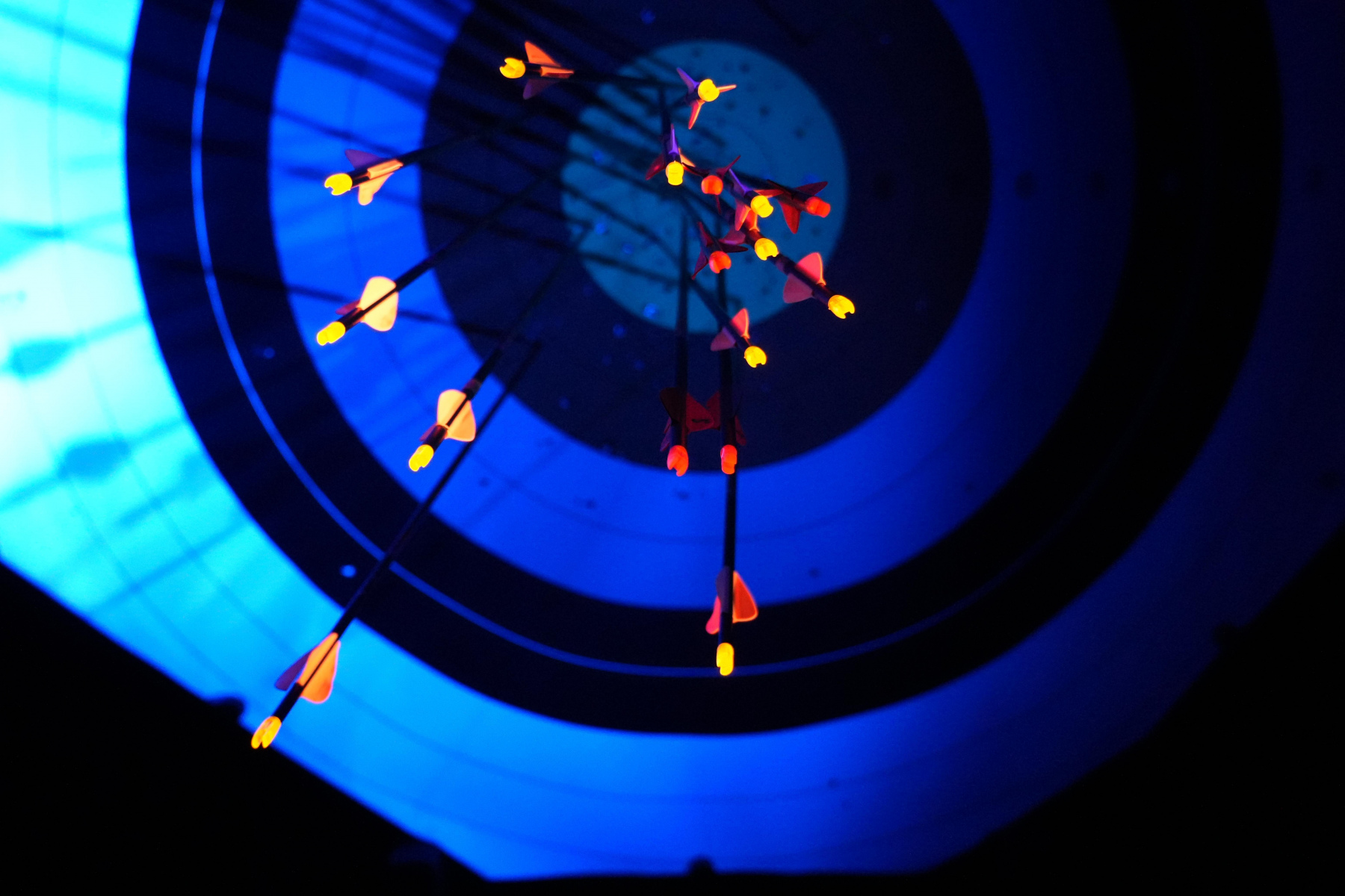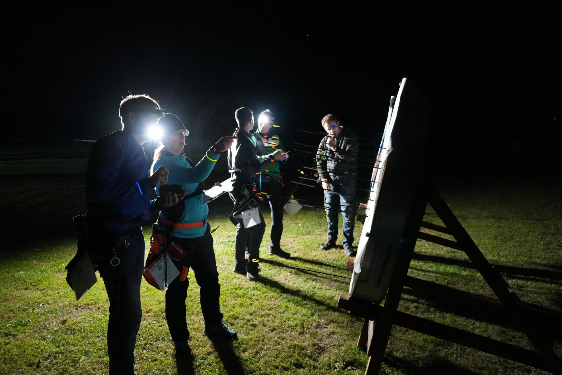 Wenn mal ein Pfeil daneben ging, wurde dieser, auch mit Hilfe von UV-Lampen, schnell gefunden, sodass es schnell weiterging. Die UV-Lampen lassen viele der Federn oder Nocken hell strahlen.