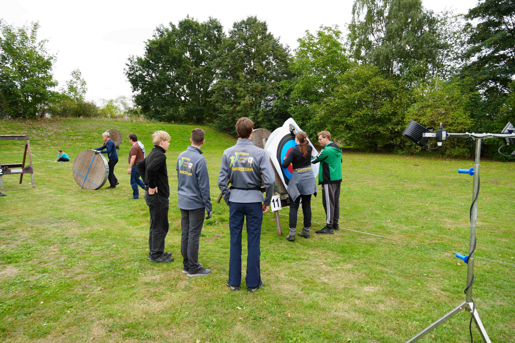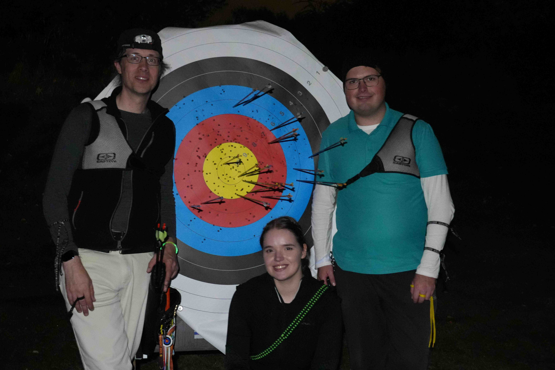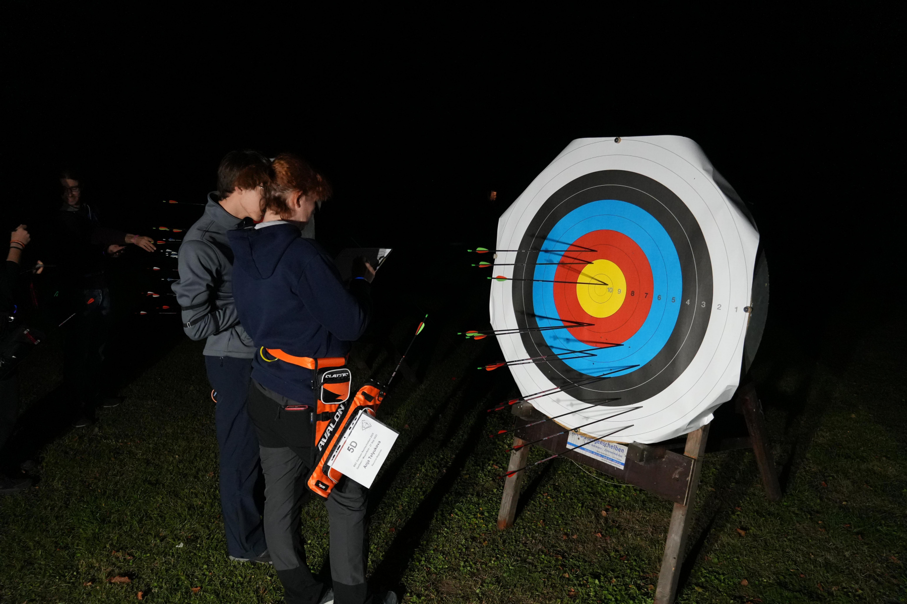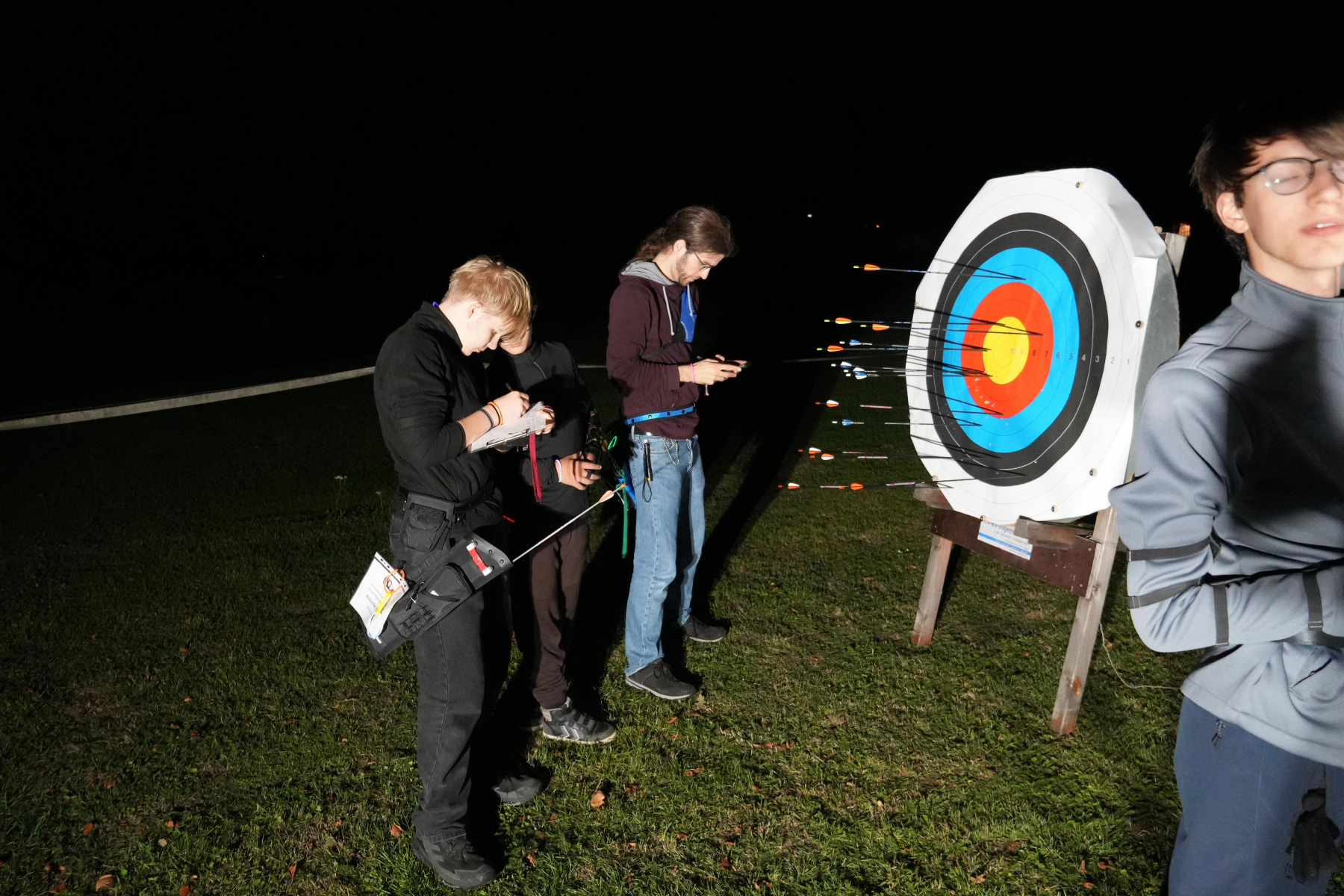 Wenn mal ein Pfeil daneben ging, wurde dieser, auch mit Hilfe von UV-Lampen, schnell gefunden, sodass es schnell weiterging. Die UV-Lampen lassen viele der Federn oder Nocken hell strahlen.