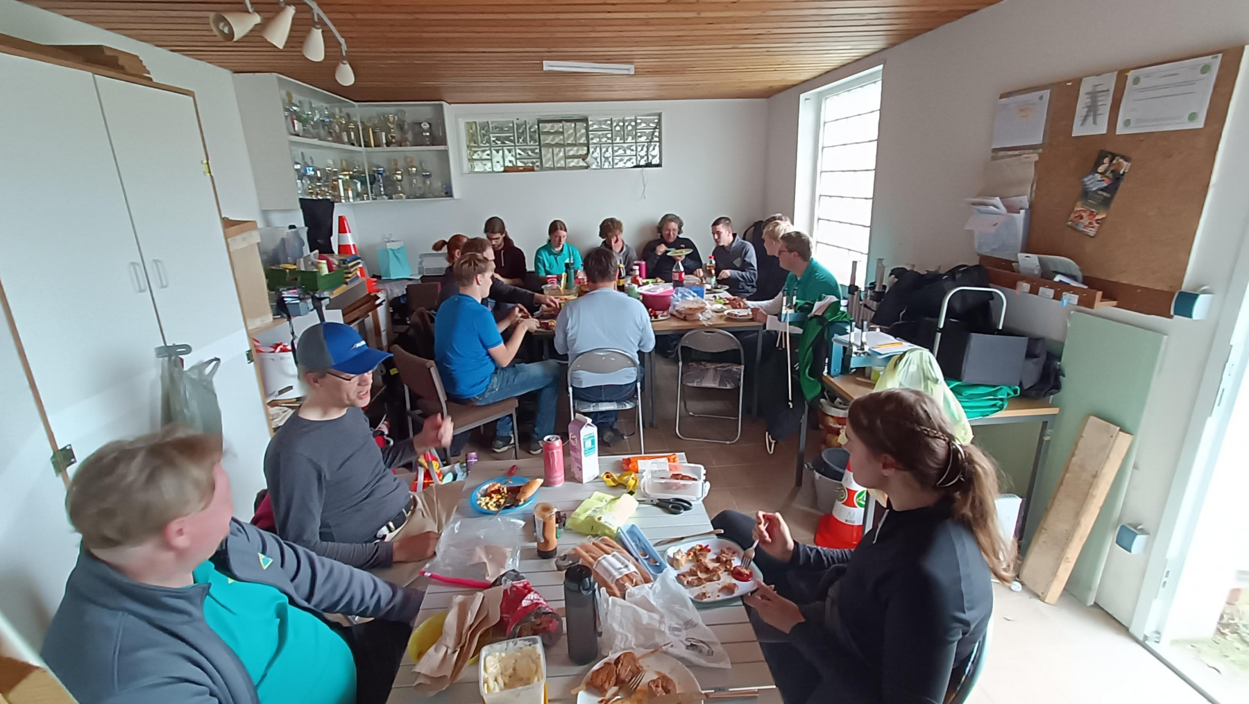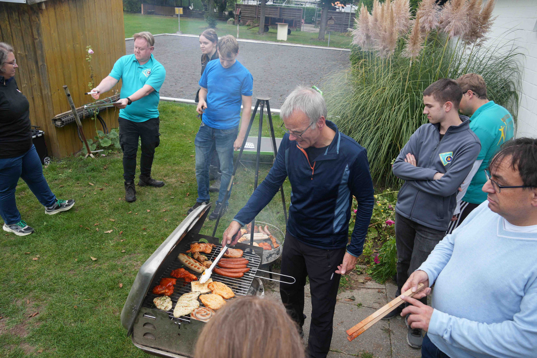 Nachdem der Aufbau fertig war, haben wir den Grill angeschmissen und den Tisch hergerichtet. Es wurden mehrere Salate, Brote und Soßen von allen mitgebracht.