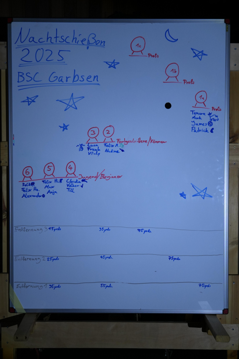 Bislang haben wir je nach Leistung in vier Gruppen (Jugend, Beginner, Fortgeschritten, Könner) auf je drei , immer kürzer werdenden, Entfernungen geschossen. Wie bei einer 900er Runde wurde auf der weitesten Entfernung begonnen. Die Entfernungen sind so gestellt, dass man auch bei Dunkelheit gut getroffen werden kann und auch der Spaß nicht zu kurz kommt. Für die neue Gruppe der „Profis“ gab es da aber eine Ausnahme: Hier wurden alle drei Runden auf 70 Meter geschossen. Und obwohl diese Idee im Spaß entwickelt wurde, haben sich doch vier Mitglieder dafür entschieden.
